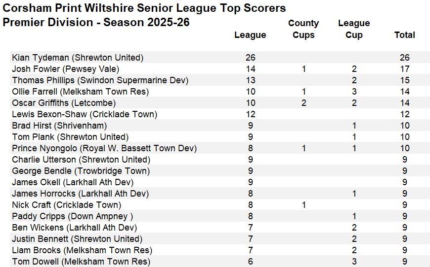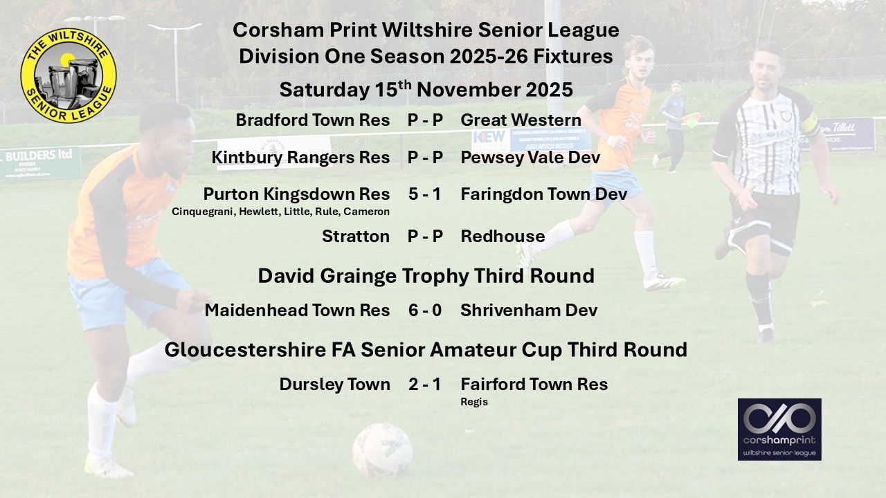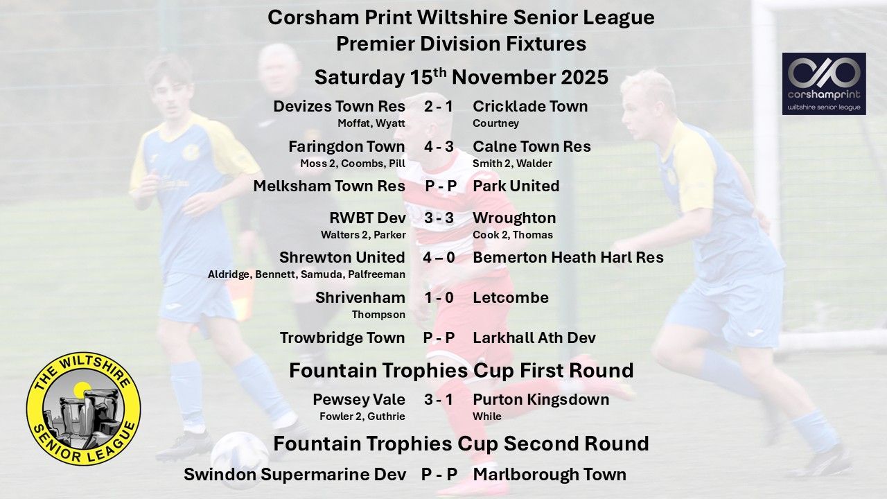 Whilst most of the schedule in the Premier Division survived the heavy rain on Friday it was a different story in Division One with three of the four scheduled league fixtures postponed due to waterlogged pitches. Thankfully the two games in county cup competitions went ahead meaning there would be no knock-on effect to next Saturday’s fixtures. Unfortunately for the two sides from the Corsham Print Wiltshire Senior League involved their participation in their respective county cup came to an end. Shrivenham Development went down 6-0 in their game away to Maidenhead Town Reserves from the Thames Valley League in their Third Round David Grainge Trophy tie, the cup competition for teams at this level in Berks and Bucks. In the equivalent competition for teams from Gloucestershire league leaders Fairford Town Reserves also fell to defeat, going down 2-1 away to Dursley Town the current leaders of the Gloucestershire Northern Senior League, Daren Regis with the Fairford goal. With Fairford having now exited both of their cup competitions focus will now be on the league and seeking to get promotion to the Premier Division in their first season in the league.