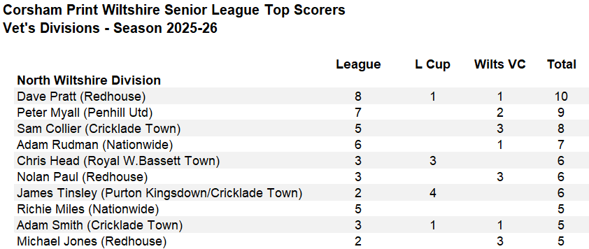 The action in the North Wiltshire Veterans’ division got underway on Monday night at Moredon and it saw Redhouse go three points clear at the top of the table with a hard fought 2-1 win over Stratton. Goals from Fred Galrito and Joe Herbert did the damage for Redhouse, Matthew Barnes with the Stratton goal.