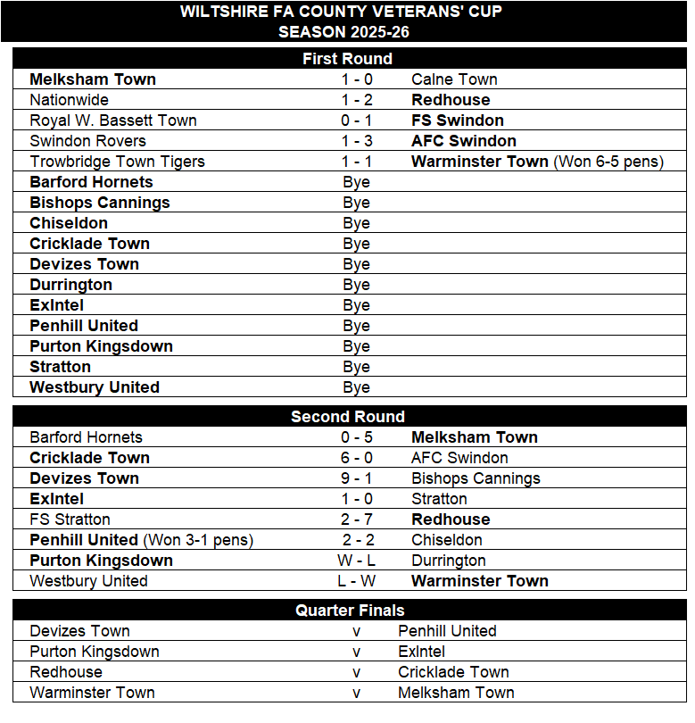 The Wiltshire FA have now made the draw for the quarter final games which are scheduled to take place in week commencing Monday 8th December. The last eight in the cup competition sees five sides from the North Wiltshire Division and three from the Mid Wiltshire Division. There is one all Mid-Wiltshire Division tie which sees Warminster Town home to Melksham Town. The other Mid Wiltshire Division side, Devizes Town, will be involved in the only cross-divisional tie when they play host to Penhill United from the North Wiltshire Division. The other two ties are both all-North Wiltshire Division ties with the tie of the round being the match up of current league leaders Redhouse with the cup holders Cricklade Town. The other all North Wiltshire Division tie sees Purton Kingsdown home to ExIntel.