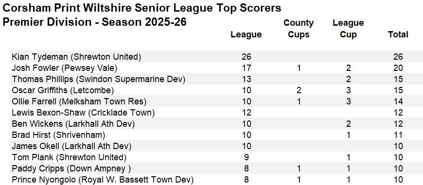 Pewsey Vale kept on the heels of Royal Wootton Bassett Town Development with a comfortable 6-2 home win over bottom of the table Calne Town Reserves. There were three more goals for Josh Fowler taking his total for the season to 20, James Guthrie scored from the penalty spot with the other two Pewsey Vale goals being scored by Connor Marsden and Kyle Bird. The win saw Pewsey remain two points behind Royal Wootton Bassett having played one game less and three points behind Melksham Town Reserves having played the same number of games as Melksham. Calne meanwhile are looking in relegation trouble but have a run of games either side of Christmas against sides in and around the bottom end of the table which could well decide whether they are going to get themselves out of trouble or not.