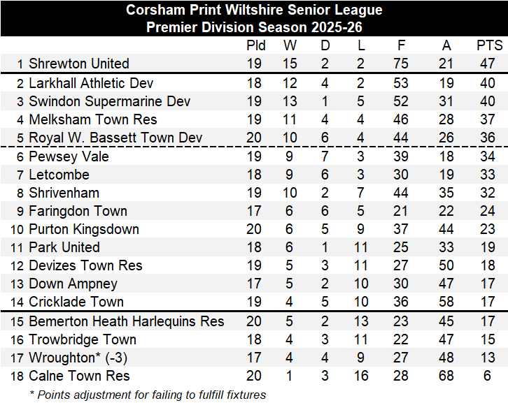 In the games that went ahead there were also surprises on the pitch with the divisional leaders in both the Premier Division and Division One falling to defeats against sides at the wrong end of the table, providing more evidence now competitive both divisions are this season. Premier Division leaders Shrewton United were away to Park United and both teams went into the game with several players missing, with home side Park United having a squad of just 12 players. As is often the way in the face of adversity, they produced one of their best performances of the season to inflict only a second defeat of the season on the league leaders Shrewton United, winning 2-1 thanks to goals from Ben Pring and Zac Hiller, Lewis Cross getting the Shrewton United reply. The win for Park United saw them climb out of the bottom four, moving up five places in the table to eleventh spot. After going 16 games unbeaten in the league, Shrewton will now look to bounce back and start another unbeaten run when they travel to Royal Wootton Bassett Town Development next week knowing that, despite the defeat, they remain seven points clear of the two sides immediately below them in the table.
