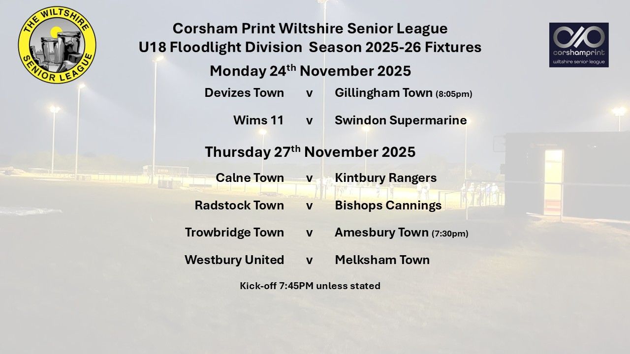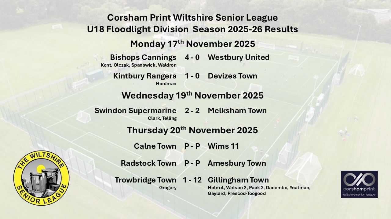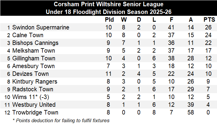 There were four games played in the Under 18 Floodlight Division of the Corsham Print Wiltshire Senior League last week. On the Monday night Kintbury Rangers picked up their third win of the season, a solitary strike from Stanley Herdman being enough to give them all three points against Devizes Town.