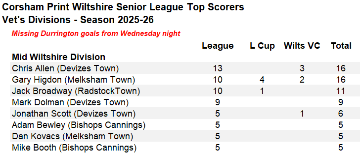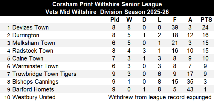 There were just three games played in the Mid Wiltshire Division with pitch conditions seeing the one game scheduled to be played on grass between Radstock Town and Melksham Town postponed. No such issues with the three games being played on 3G pitches which saw both Devizes Town and Durrington pick up big wins with Devizes extending their lead at the top of the table and Durrington move up into second place behind Devizes.