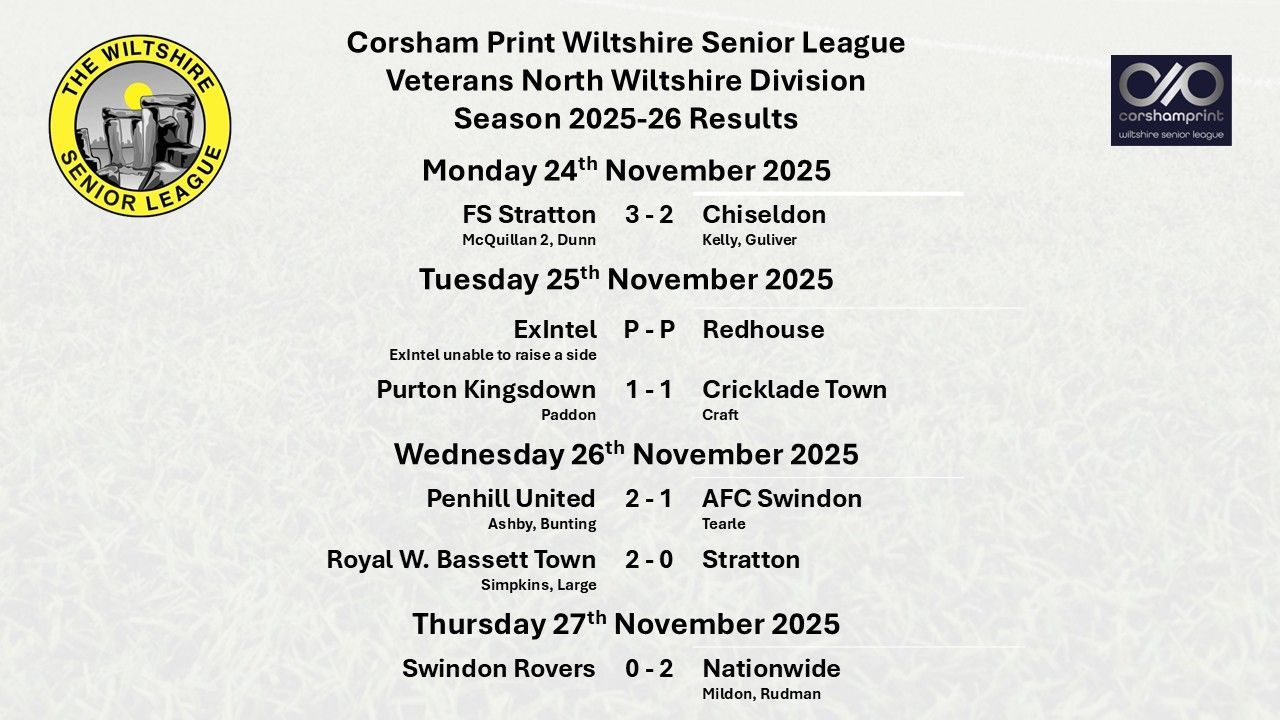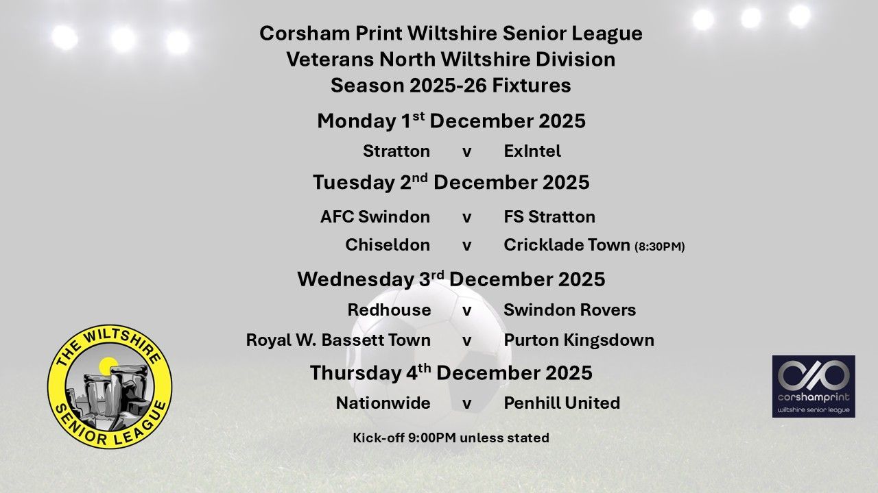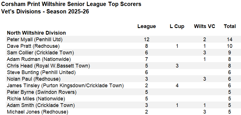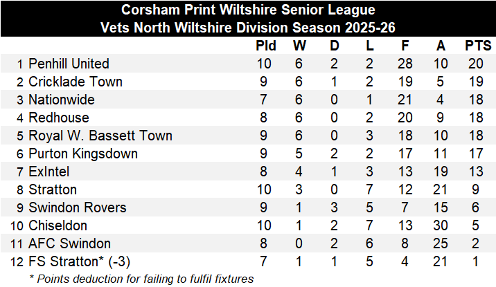The title race in the North Wiltshire Veterans’ Division of the Corsham Print Wiltshire Senior League is shaping up to be one of the most exciting since the Veterans’ category was established. After this week’s round of matches there are just three points separating the top six sides. There are also now new leaders of the division after Penhill United went top as a result of a narrow 2-1 win over AFC Swindon whilst Cricklade Town were dropping points and Redhouse were left frustrated by ExIntel calling their game off due to being unable to raise a side for the second week running. On target for Penhill in that win over AFC Swindon were Jamie Ashby and Steve Bunting, Phil Tearle pulling one back for AFC Swindon ten minutes from time, all three goals coming in the second half of the encounter at Moredon on Wednesday night.