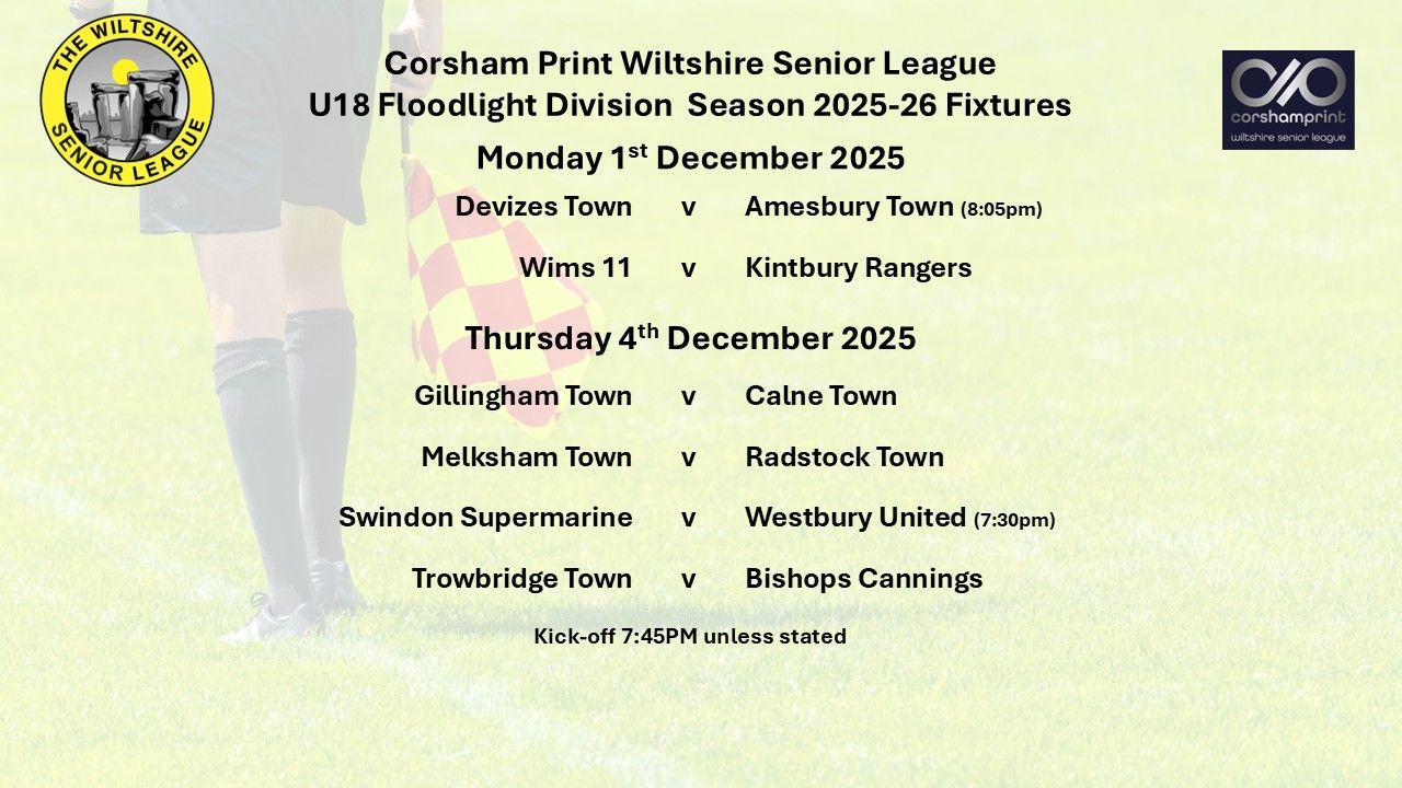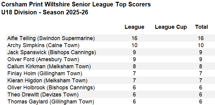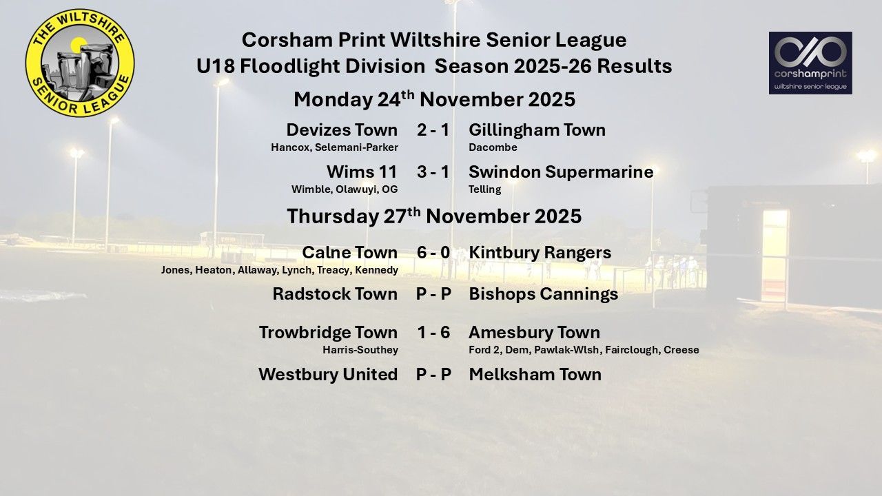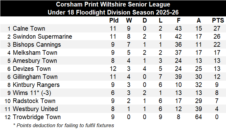 There were again four games played in the Under 18 Floodlight Division of the Corsham Print Wiltshire Senior League last week and one of those games saw the last unbeaten record in the division fall, as Swindon Supermarine were defeated for the first time this season, going down 3-1 away against Wims 11 at Mangotsfield. The game on Monday night saw the two teams turn around at the break with the game still awaiting its first goal. However, the spectators didn’t have to wait long in the second half Okikiola Olawuyi putting Wims ahead within a minute of the restart after good work from Billy Wimble. Wimble then scored a goal of his own from the penalty spot, and an own goal then put Wims 3-0 ahead. There was to be a late goal for Swindon Supermarine deep into injury time, but it was nothing more than a consolation goal scored by the division’s leading scorer Alfie Telling who took his total for the season to 16. The defeat coupled with results elsewhere saw Swindon Supermarine lose their leadership of the division.