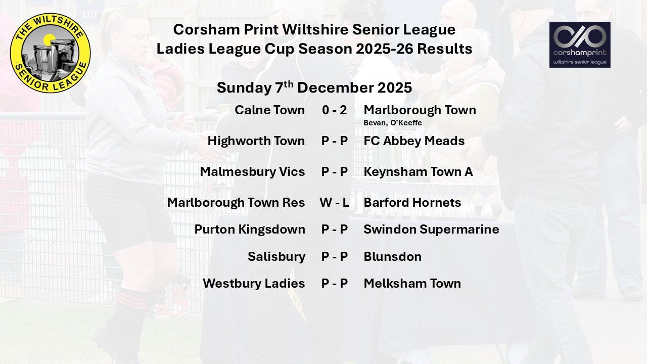 Sunday was scheduled to be the First Round of the Ladies League Cup with seven ties scheduled but in the end just one game was played with one game also being awarded due to Barford Hornets being unable to raise a side for their away tie at Marlborough Town Reserves. The heavy rain of the weekend saw five of the scheduled ties postponed due to waterlogged pitches.