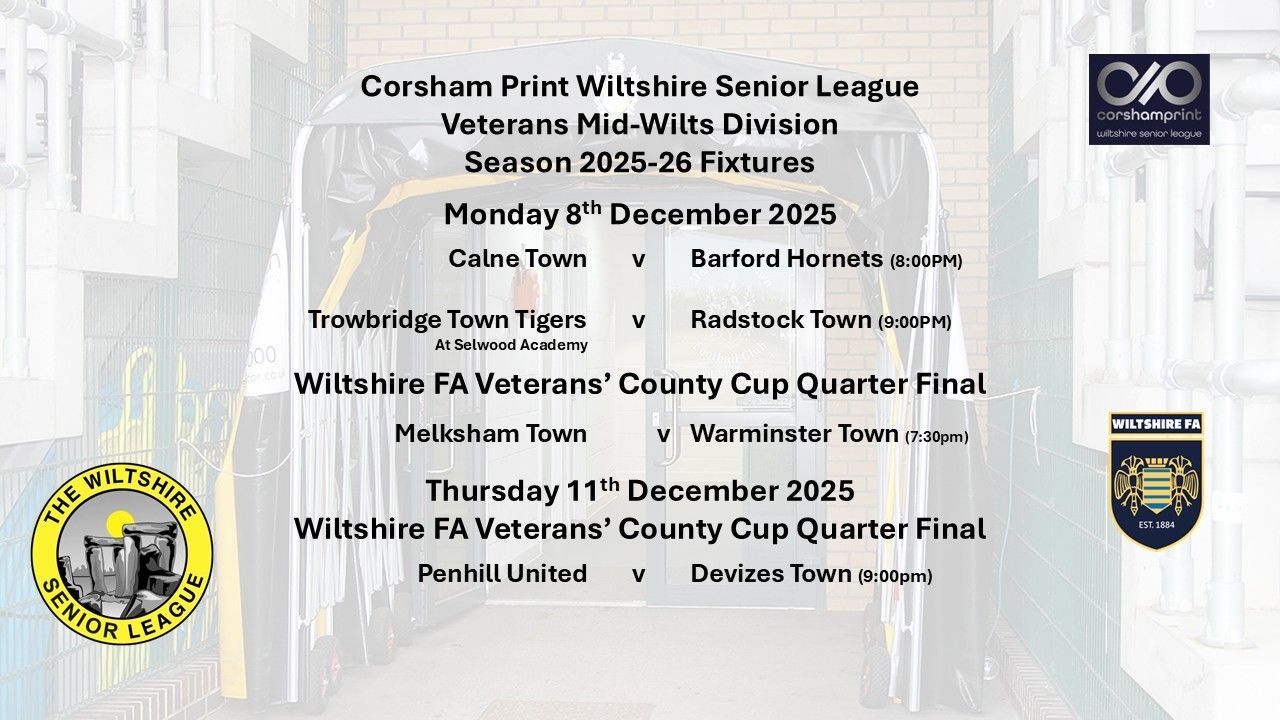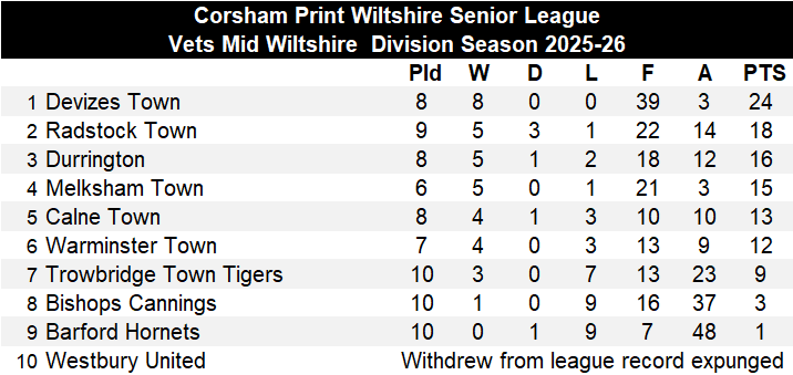For the second week running there were again just three games played this week in the Mid Wiltshire Veterans’ Division of the Corsham Print Wiltshire Senior League with the big game at the top of the table between Devizes Town and Melksham Town being postponed due to a waterlogged pitch. Trowbridge Town proactively ensured their game on Monday night against Radstock Town went ahead by switching the game to the 3G at Selwood Academy. The two sides then proceeded to play out something of a goal fest as the two sides found the back of the net ten times between them, Radstock eventually emerging victorious 6-4. Alastair Cox led the way scoring a hat-trick, Jack Broadway bagged a brace with the other goal coming through Robbie Cunningham.