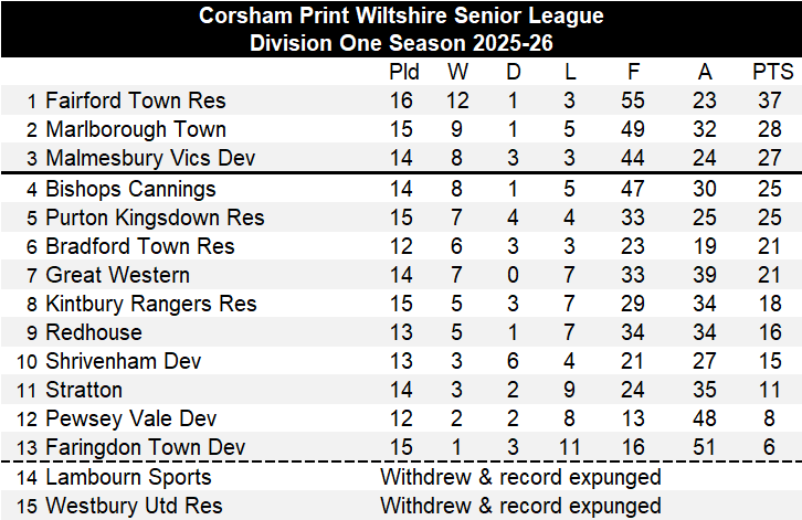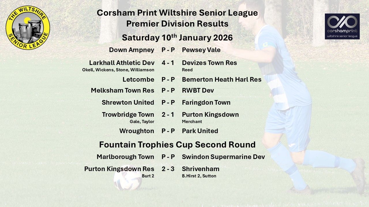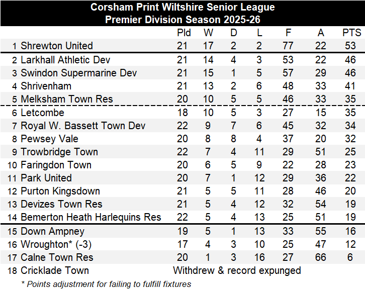 The cold weather once again decimated the fixtures in the two men’s divisions of the Corsham Print Wiltshire Senior League with just five games being played, three of which were on 3G surfaces showing the benefit of such pitches this time of the year. However, special credit must go to both Faringdon Town and Trowbridge Town who were able to stage games on grass surfaces when all over the country other games on grass fell to frozen pitches. In the end there were two games played in both the Premier Division and Division One of the league, with one game also getting played in the Fountain Trophies Cup leaving just two more games now to complete the Second Round.