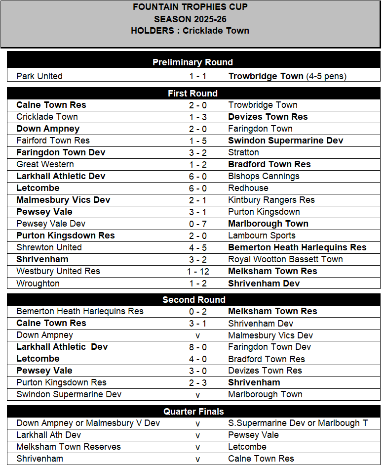 Full details of the results so far in the Fountain Trophies Cup and the quarter final games as they currently stand is shown below: