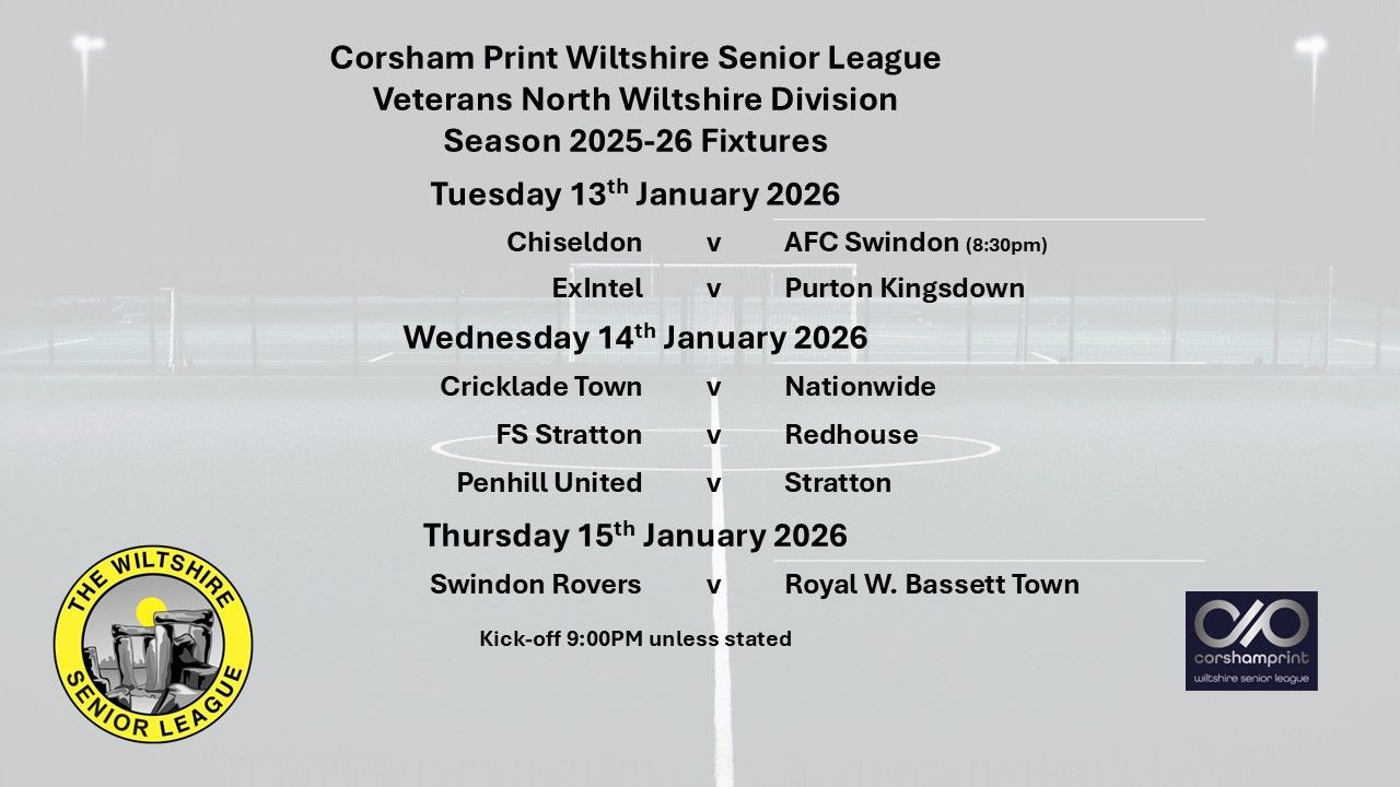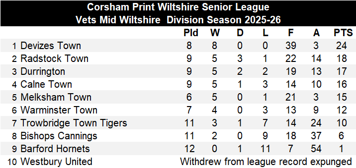 The one scheduled league game in the Mid Wiltshire Veterans' Division between Warminster Town and Durrington was postponed due to a waterlogged pitch.