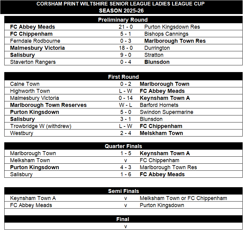 It was a much tighter affair between Purton Kingsdown and Marlborough Town Reserves with the Premier Division side Purton Kingsdown eventually edging it by the odd goal in seven. There were two goals for Evie O’Rouke and one apiece for Amy Hards and Stephanie Quince. Full details of the League Cup so far this season ahead of Melksham Town's midweek quarter final tie against FC Chippenham is as follows: