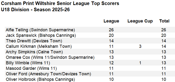 There were then four games played on Thursday night including Calne Town’s visit to Gillingham Town where Calne kept their title challenge on track in a high scoring game. Two goals from both Alexander Greenouff and Archy Simpkins helped Calne to an 8-3 win, the other goals coming through Ruben Allaway, Owen Jones, Joseph Reynolds and Freddie Treacy, Thomas Gaylard amongst the goals for Gillingham Town. The win for Calne saw them move to within two points of leaders Swindon Supermarine with two games in hand.