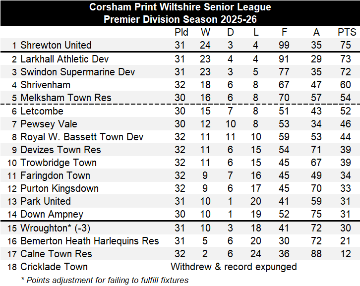 The two of the sides who sit just one point above Wroughton in the table also have big games today, Park United travel to Melksham Town Reserves for an early kick-off knowing a win will guarantee their safety.