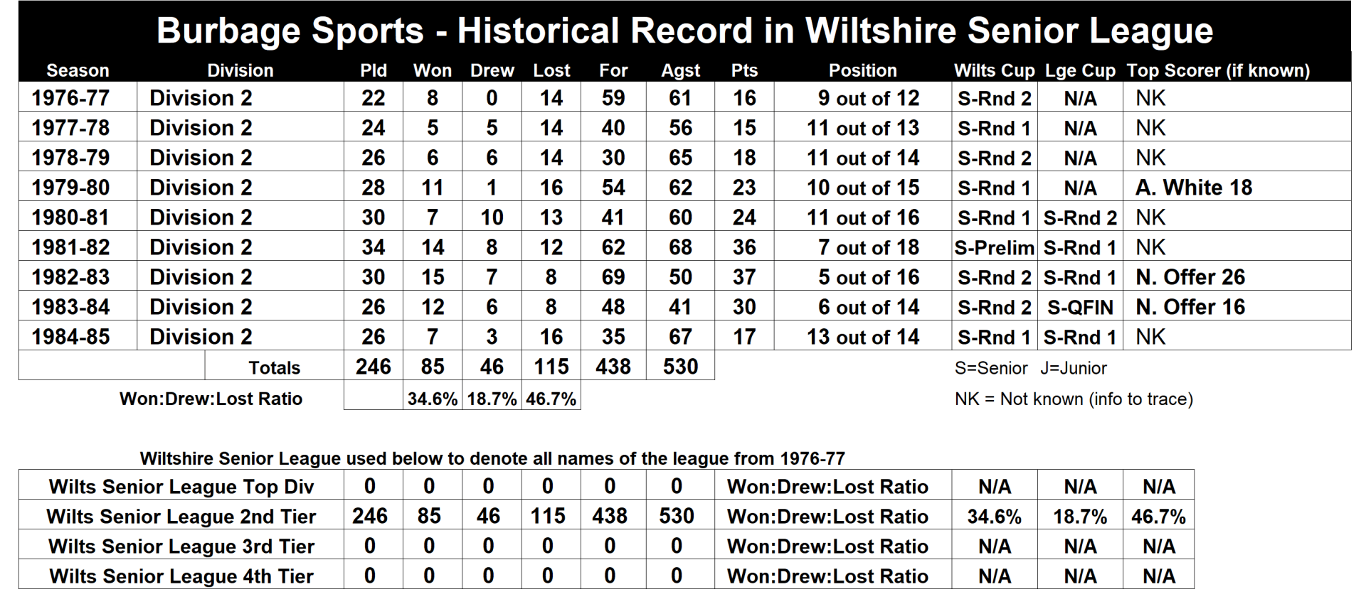 Burbage Sports were founder members of the league, starting in Division Two as a Senior club. Just prior to the formation of the new Wiltshire County League, Burbage had been members of the old Wiltshire League and the two seasons prior to the new league being formed had seen them play in Division One of that league. These two seasons had been very successful for the side based six miles south of Marlborough. Season 1974-75 saw them finish up as runners-up, just three points behind eventual champions Malmesbury. The following season was another good one but they dropped three places to finish in fourth spot, although they would have been pleased to have finished above near neighbours Pewsey Vale.