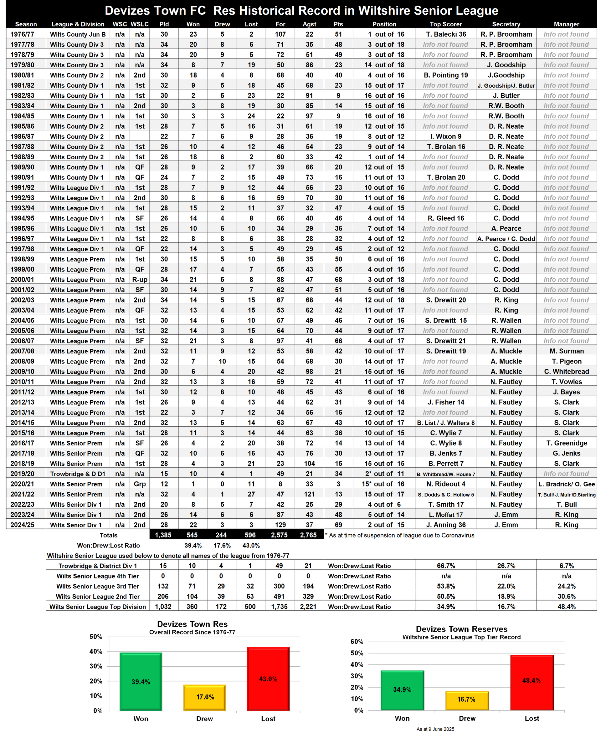 Season 2024-25 would prove to be a highly successful one for Devizes Town Reserves under manager Ray King as they pushed Cricklade Town all the way in the race for the Division One title, eventually finishing second just three points behind the eventual champions and securing promotion back to the Premier Division after three seasons in Division One.