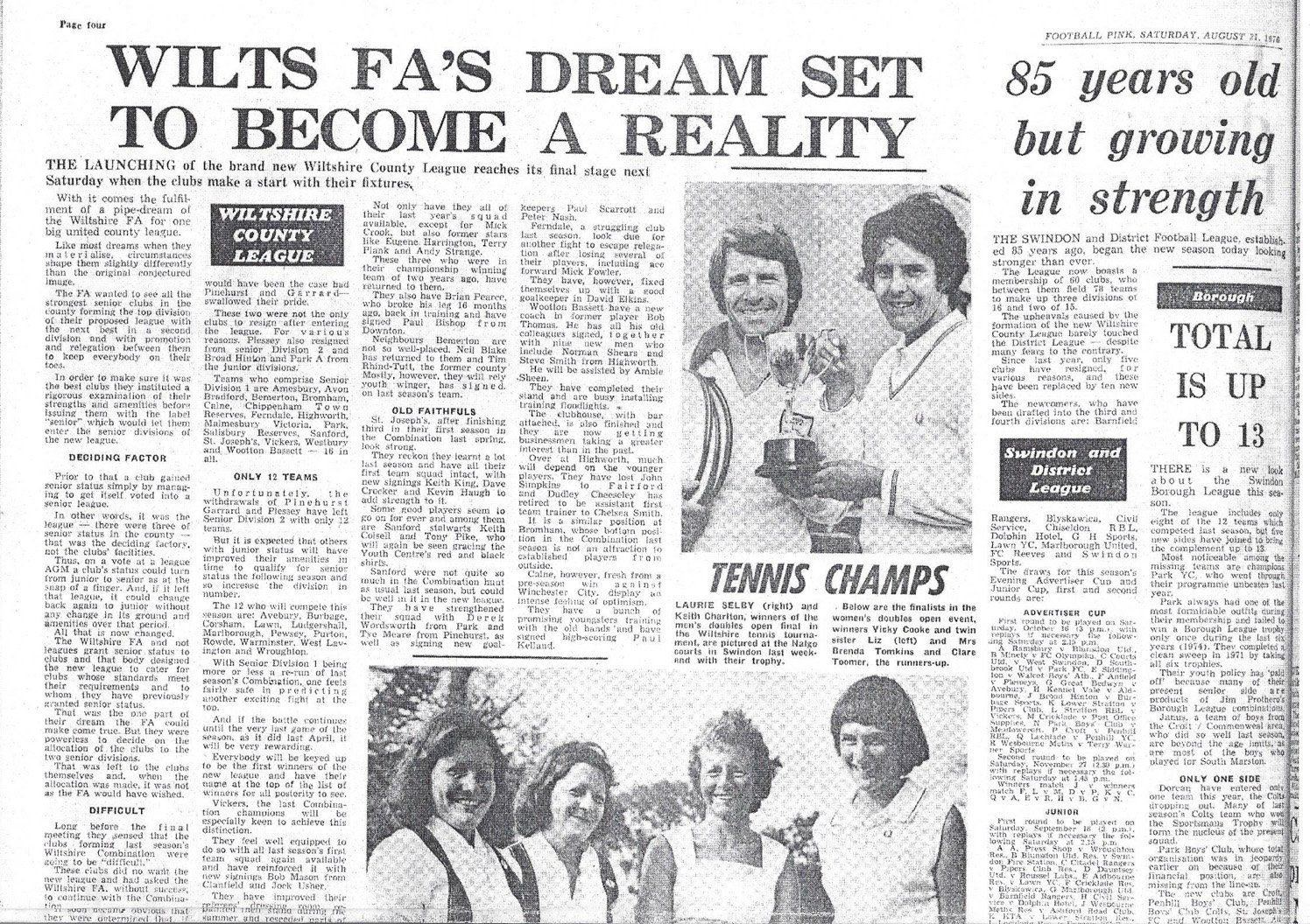 The launching of the brand new Wiltshire County League reaches its final stage next Saturday when the clubs make a start with their fixtures. With it comes the fulfilment of a pipe-dream of the Wiltshire FA for one big united county league. Like most dreams when they materialise, circumstances shape them slightly differently than the original conjectured image. The FA wanted to see all the strongest senior clubs in the county forming the top division of their proposed league with the next best in a second division and with promotion and relegation between them to keep everybody on their toes.