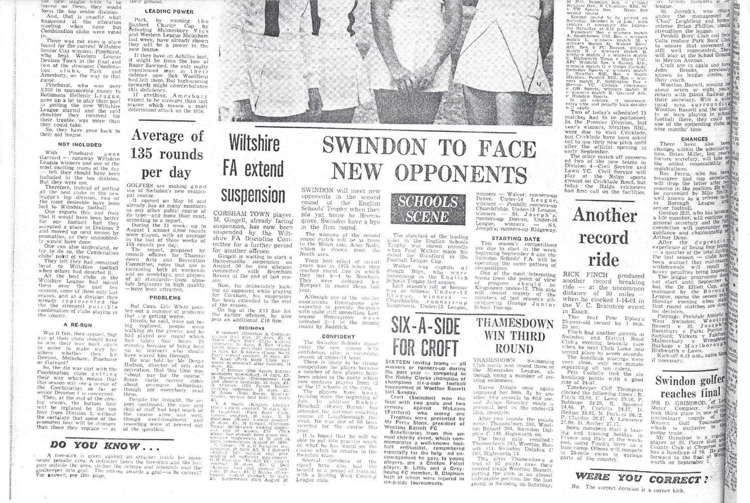 Wootton Bassett have a new coach in former player Bob Thomas. He has all his old colleagues signed together with nine new men who include Norman Shears and Steve Smith from Highworth. He will be assisted by Amble Sheen. They have completed their stand and are busy installing training floodlights. The clubhouse with bar attached is also finished and they are now getting businessmen taking a greater interest than in the past.