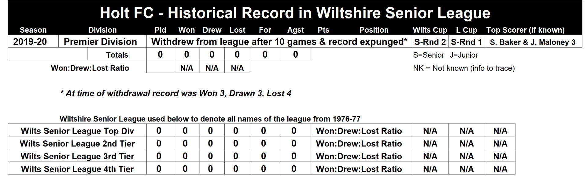 Despite efforts by the league to see if Holt could continue it was confirmed at the January 2020 Management Committee that they had withdrawn from the league. With Holt having played only ten league fixtures, lower than the 75% threshold, their record has been expunged from the league table in accordance with FA rules. In the end the whole was to be declared “null and void” by the FA but by the time that decision was made Holt had withdrawn from the league already.